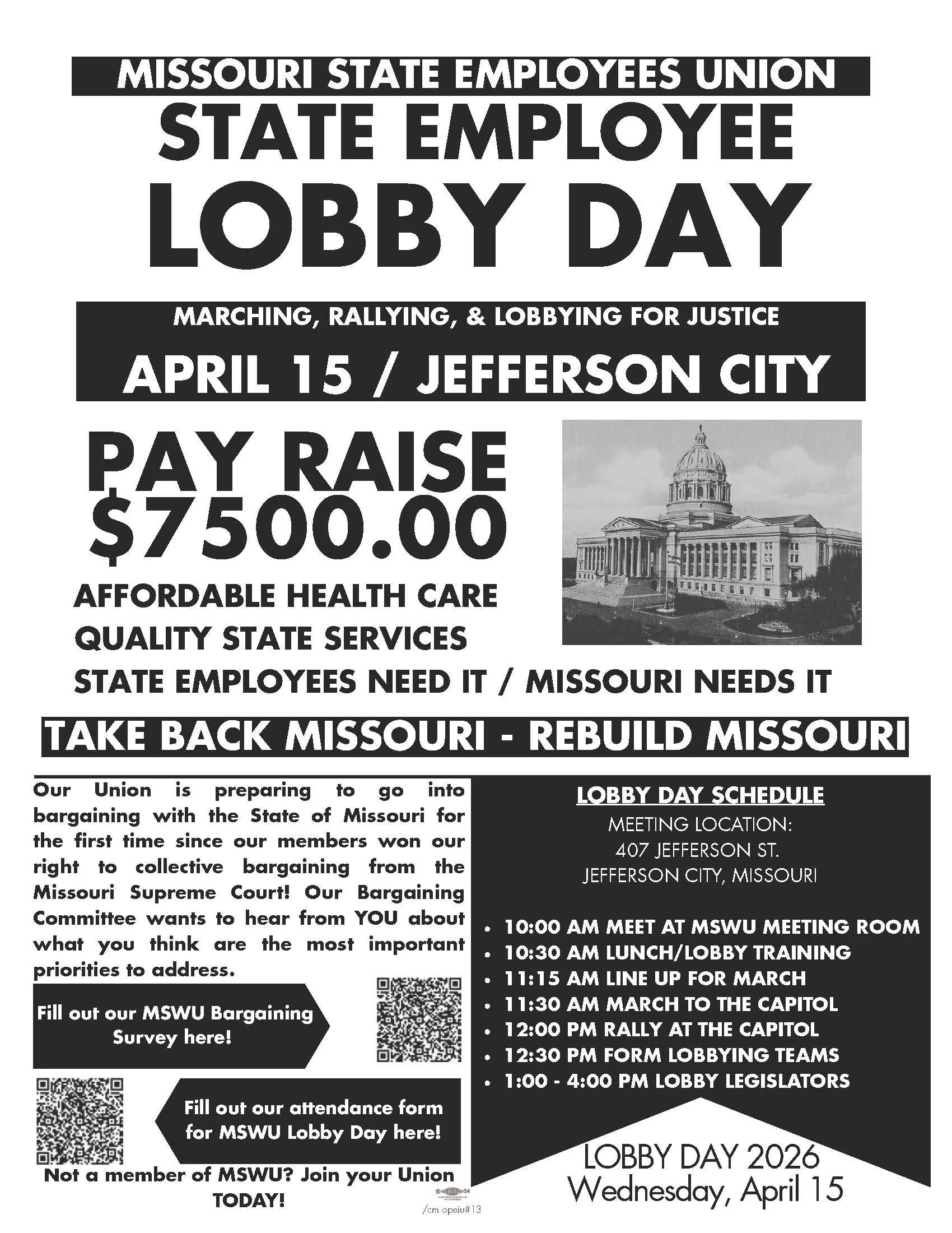 We are taking the fight to the capitol. Join us on April 15th to march to the capitol and talk to legislators about why it is imperative that Missouri State Workers get a raise this year, to bring them to a living wage!